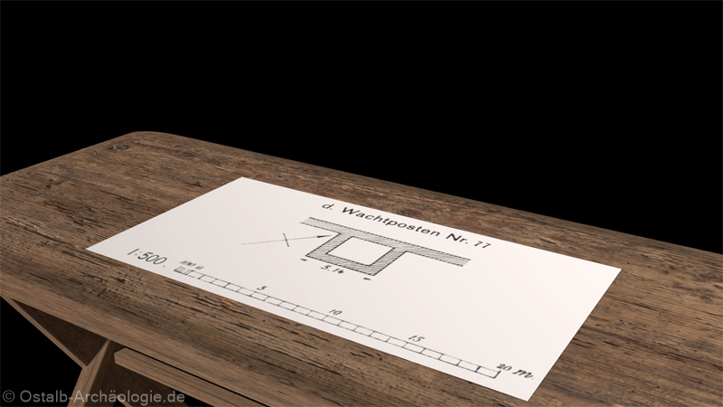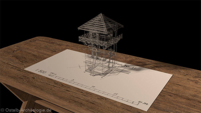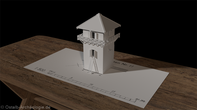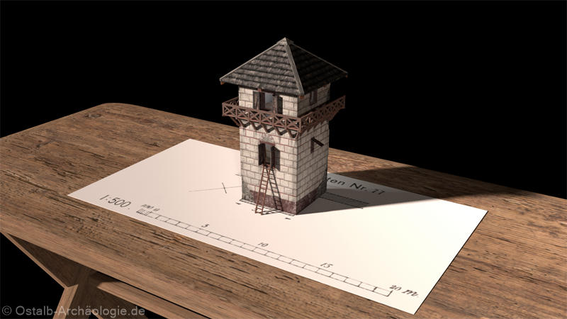 Die Vorlage für die Rekonstruktion des Limesturms in Steinbauweise ist die Befundaufnahme des Limeswachturms WP 12/77 aus dem Jahr 1885. Weiter wurden Erkenntnisse aus schriftlichen Quellen und Abbildungen aus Fachliteratur in das 3D-Modell mit einbezogen.